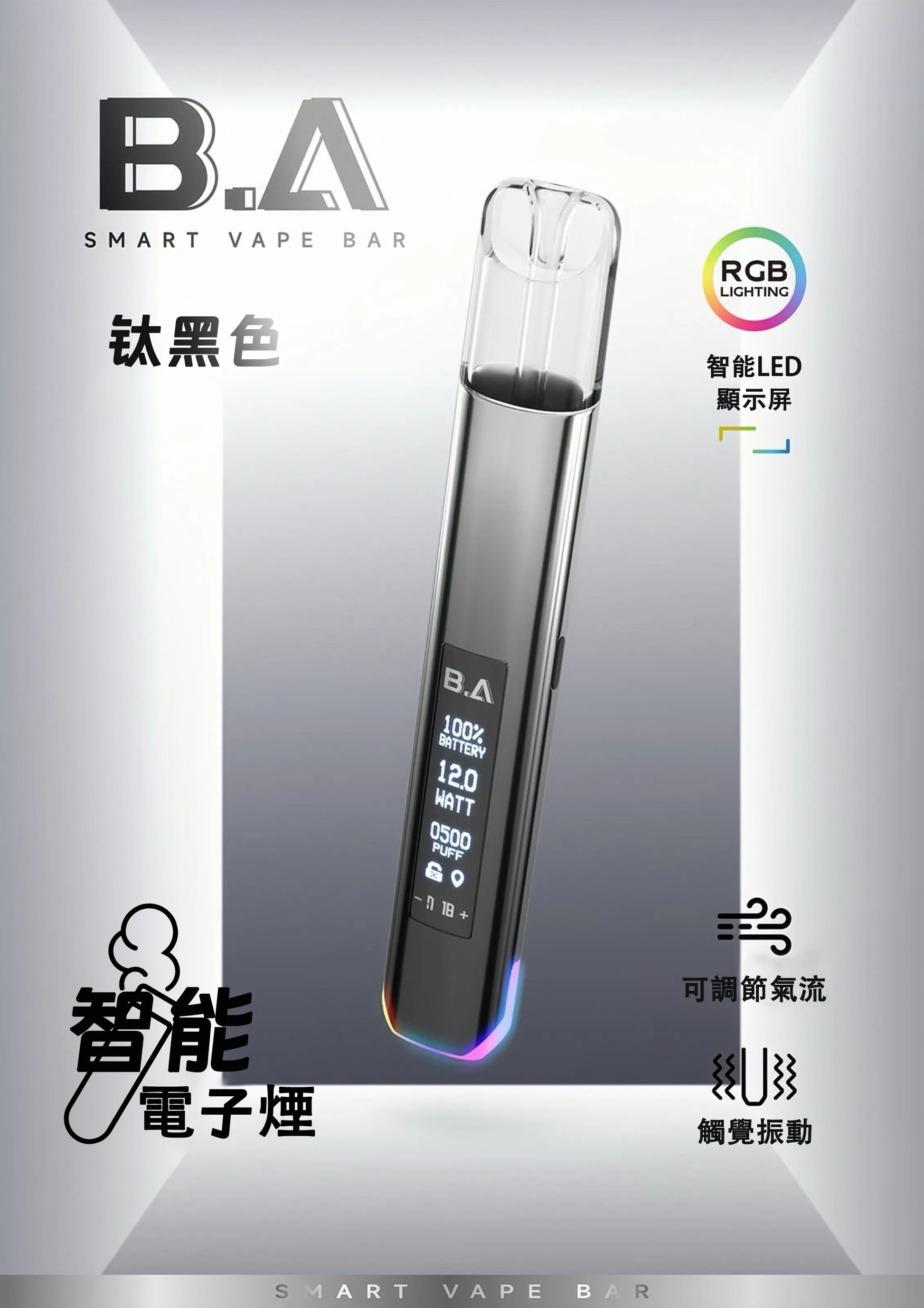 B.a主機一代煙彈通用的發光電子煙,擁有RGB炫彩燈光和智能LED顯示屏,帶來即時的電量和氣流信息。它不僅具備觸感震動回饋和可調吸阻,還有多種顏色可供選擇,設計時尚輕巧,金屬質感,並支持Type-C快充,智能防乾燒,口感細膩穩定,是科技潮品的隨身焦點。